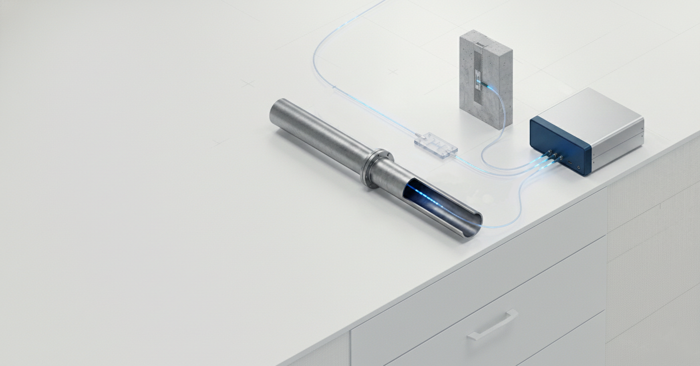 Sensores em fibra óptica para pontes, barragens, túneis e infraestrutura crítica. Detecção precoce de deformações e anomalias com precisão submilimétrica.